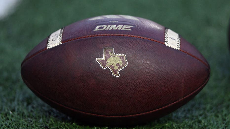 SAN MARCOS, TX – OCTOBER 28: A practice ball displays the Texas State Bobcats logo during game featuring the James Madison Dikes and the Texas State Bobcats on October 28, 2025 at UFCU Stadium in San Marcos, TX. (Photo by John Rivera/Icon Sportswire