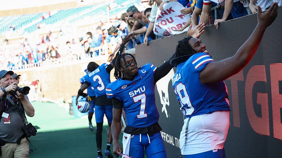 DALLAS, TX – November 22: SMU Mustangs quarterback Kevin Jennings (#7) high fives fans during the college football game between the SMU Mustangs and the Louisville Cardinals on November 22, 2025, at Gerald J. Ford Stadium in Dallas, TX. (Photo by Mat