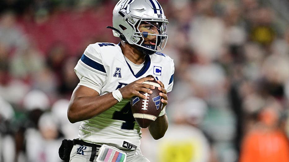 TAMPA, FLORIDA – NOVEMBER 29: Chase Jenkins #4 of the Rice Owls looks to throw a pass in the first half of a game against the South Florida Bulls at Raymond James Stadium on November 29, 2025 in Tampa, Florida. (Photo by Julio Aguilar/Getty Images)