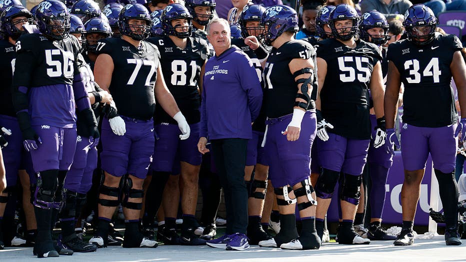 FORT WORTH, TEXAS – NOVEMBER 29: Head coach Sonny Dykes of the TCU Horned Frogs stands with his team before the game against the Cincinnati Bearcats at Amon G. Carter Stadium on November 29, 2025 in Fort Worth, Texas. (Photo by Ron Jenkins/Getty Imag