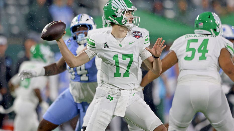 NEW ORLEANS, LOUISIANA – DECEMBER 5: Quarterback Drew Mestemaker #17 of the North Texas Mean Green throws in the second quarter against the Tulane Green Wave during the 2025 American Conference Football Championship at Yulman Stadium on December 5, 2