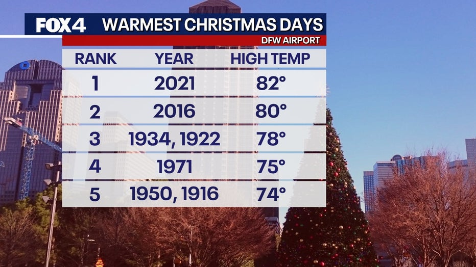 The official high temperature for Thursday was 80 degrees. A record of 82 degrees was set in 2021. It was also 80 degrees on Christmas Day in 2016.