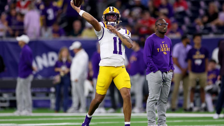 Michael van Buren Jr. #11 of the Louisiana State Tigers warms up before the game against the Houston Cougars during the Kinder’s Texas Bowl at NRG Stadium on December 27, 2025, in Houston, Texas. (Photo by Tim Warner/Getty Images)