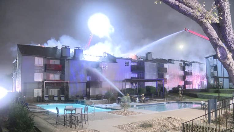 DALLAS – Firefighters pulled five people from a burning apartment complex in Northeast Dallas early Sunday morning after a fire tore through the roof of a three-story building.