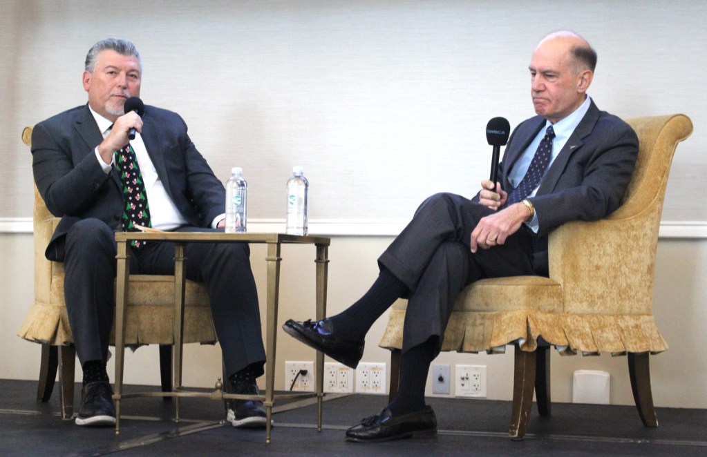 Fort Worth City Manager Jay Chapa (left) and retired Fort Worth Assistant City Manager Fernando Costa discuss economic development, the Texas Legislature and other topics at a Dec. 16 event at River Crest Country Club. (Fort Worth Report |Scott Nishimura | Fort Worth Report)