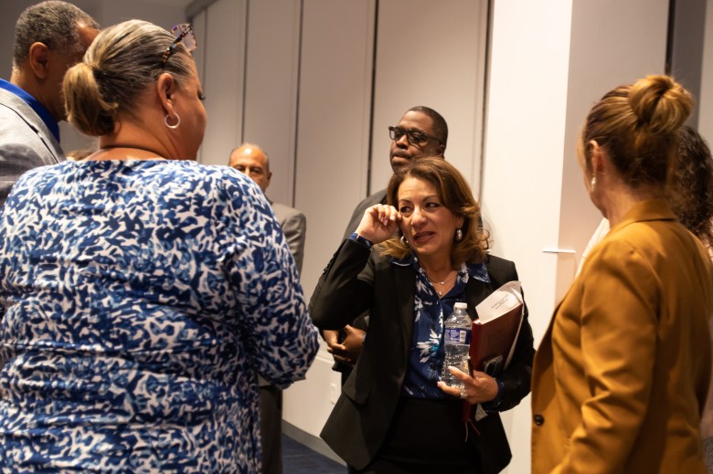 Superintendent Diana Sayavedra, who remained mostly stoic during a Board of Trustees meeting concerning her future with the district, cries as she thanks her administrative staff at the conclusion of the meeting, June 3, 2025. (Corrie Boudreaux/El Paso Matters)