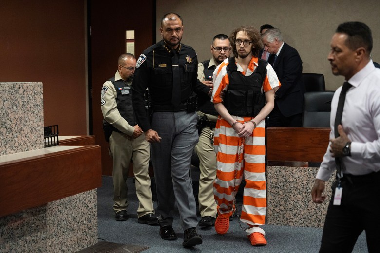El Paso Sheriff Oscar Ugarte escorts Patrick Crusius out of the courtroom after the conclusion of victim statements and the end of the state trial for his crimes at the Enrique Moreno County Courthouse on April 22, 2025.