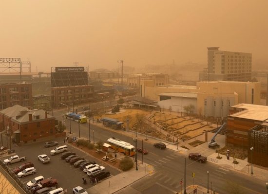 A view of Downton after the National Weather Service El Paso on Thursday, March 6, 2025, issued a triple-threat warning of strong winds, blowing dust and critical fire conditions. (Bill Pitchkolan / El Paso Matters)