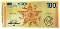 The Redback Gold Notes are inspired by promissory notes issued by the Republic of Texas in the late 1830s. They are issued in three weights: 5 centigram (cg), featuring the Texas longhorn; 20 cg, featuring the Texas State Capitol dome, and 100 cg, featuring the Alamo.