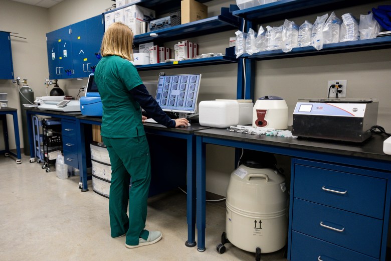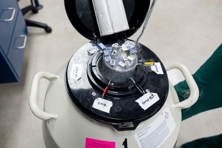 Katie Balloch, director of embryological training and education at IVF Academy USA, examines egg, sperm and embryo samples from a liquid nitrogen tank. Credit: Amber Esparza / San Antonio Report