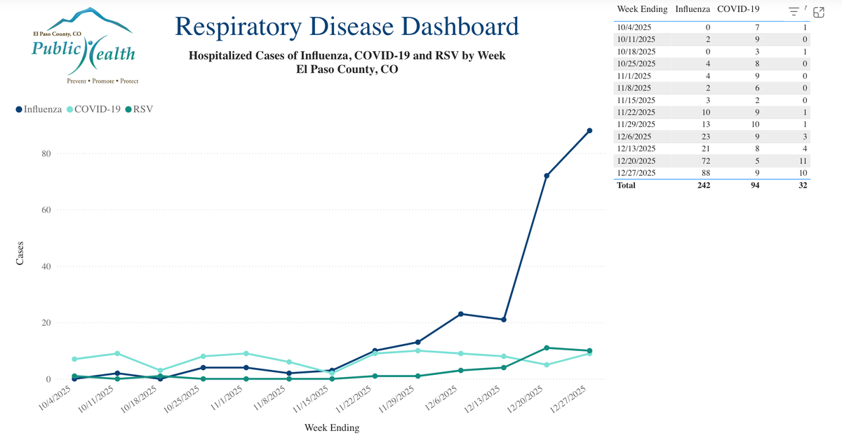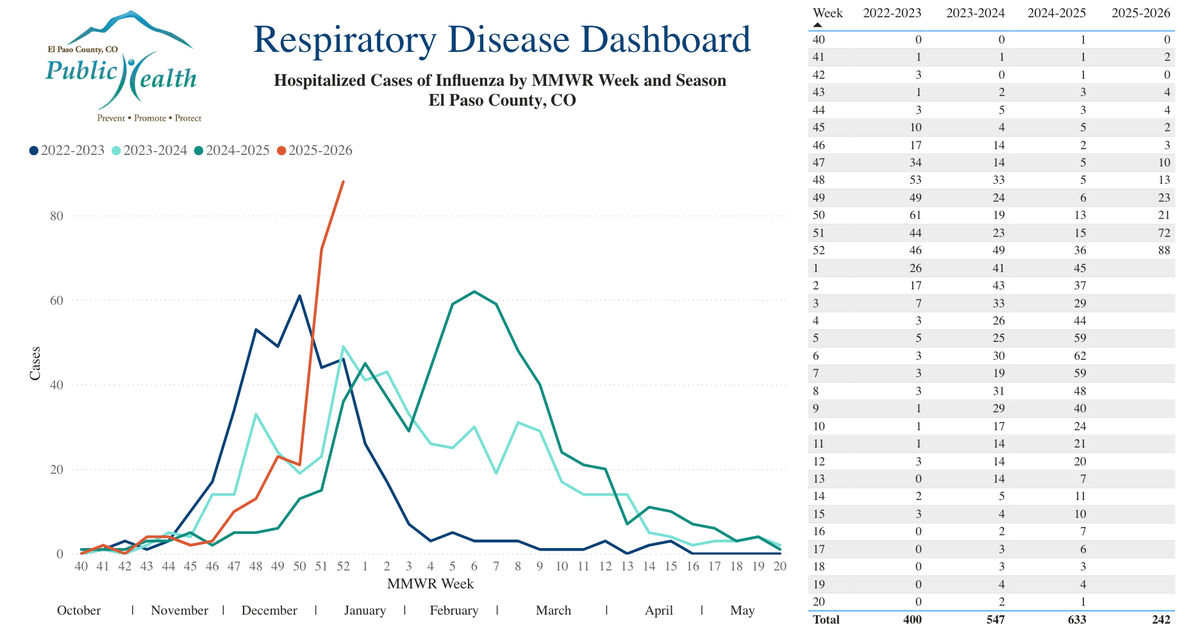 The latest influenza, or flu, data comes from Christmas week, which ended on December 27. In that week in El Paso County, 88 people were sent to the hospital because of the flu. That’s practically twice as many hospitalizations as each of the previous three flu seasons.