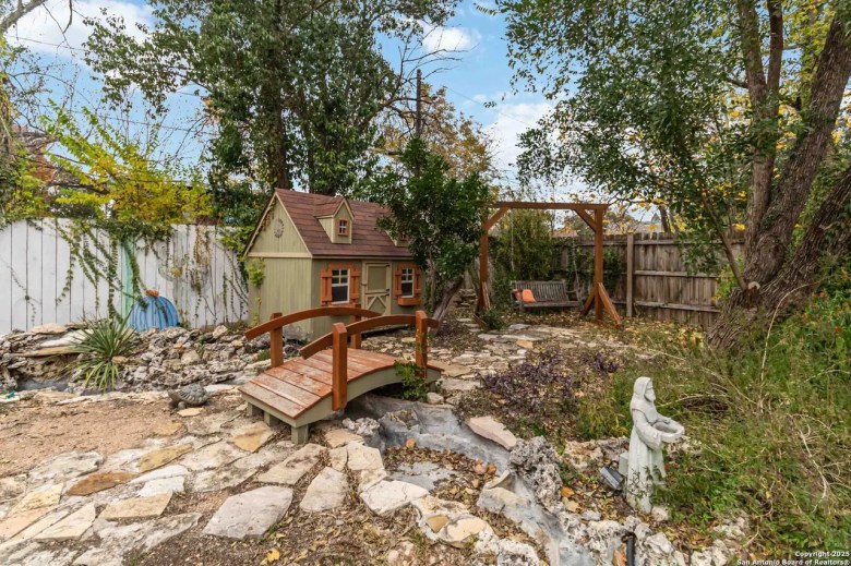 A screened in back patio houses a hot tub, while the native-landscaped backyard features a child’s playhouse, a footbridge and wooden swing built for two.