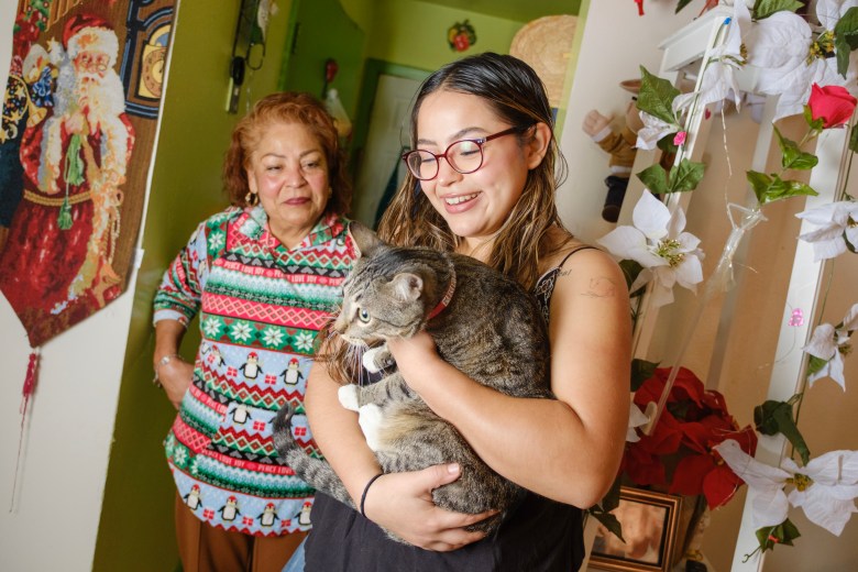 Alynn Jimenez Miranda holds the family cat Mechón alongside her grandmother Maria Teresa in the dining room of their home on the East Side. Credit: Clint Datchuk for the San Antonio Report