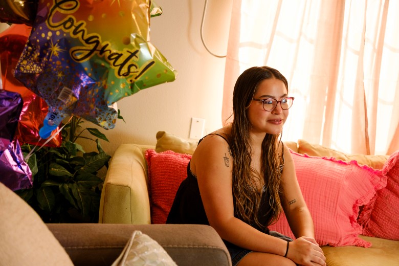 Alynn Jimenez Miranda poses for a portrait in the living room of her grandmother’s home on the East Side. Alynn has returned from Trinity University for the holiday break and the family is celebrating a sibling’s graduation. Credit: Clint Datchuk for the San Antonio Report