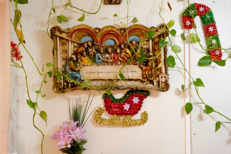 A wall in the East Side home of Alynn Jimenez Miranda is adorned with flowers, plants, Christmas decorations, and artwork. Credit: Clint Datchuk for the San Antonio Report