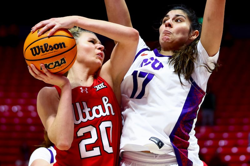 TCU Horned Frogs center Kennedy Basham (0) grabs a rebound during the first half of a women’s basketball game against Utah at the Huntsman Center in Salt Lake City on Saturday, Jan. 3, 2026. | Rio Giancarlo, Deseret News