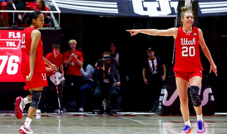 Utah forward Reese Ross (20) points to guard Lani White (0) after White hit a 3-pointer during the second half of a women’s basketball game against the TCU Horned Frogs at the Huntsman Center in Salt Lake City on Saturday, Jan. 3, 2026. | Rio Giancarlo, Deseret News