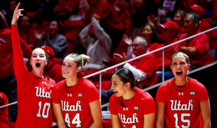 Utah guard Grace Foster (10), forward Sam Crispe (44), forward Kamryn Mafua (14) and forward Alyssa Blanck (15) celebrate a made 3-pointer from the bench during the second half of a women’s basketball game against Utah at the Huntsman Center in Salt Lake City on Saturday, Jan. 3, 2026. | Rio Giancarlo, Deseret News