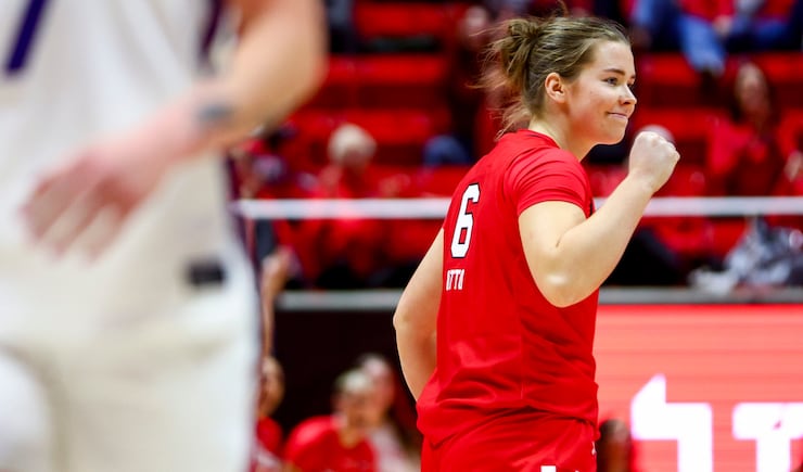 Utah forward Evelina Otto (6) celebrates after making a 3-pointer during the first half of a women’s basketball game against the TCU Horned Frogs at the Huntsman Center in Salt Lake City on Saturday, Jan. 3, 2026. | Rio Giancarlo, Deseret News