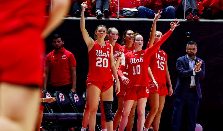 The Utah bench celebrates a made 3-pointer during the first half of a women’s basketball game against the TCU Horned Frogs at the Huntsman Center in Salt Lake City on Saturday, Jan. 3, 2026. | Rio Giancarlo, Deseret News