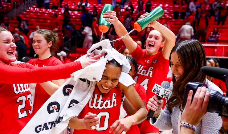Utah guard Lani White (0) is doused by her teammates during an interview after Utah defeated the No. 8 TCU Horned Frogs 87-77 in overtime at the Huntsman Center in Salt Lake City on Saturday, Jan. 3, 2026. | Rio Giancarlo, Deseret News