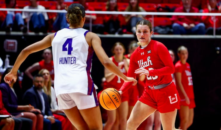 Utah guard Maty Wilke (23) moves the ball upcourt against TCU Horned Frogs guard Donovyn Hunter (4) during the first half of a women’s basketball game at the Huntsman Center in Salt Lake City on Saturday, Jan. 3, 2026. | Rio Giancarlo, Deseret News