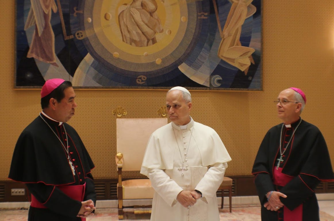 Pope Leo XIV greets El Paso Bishop Mark J. Seitz (right and El Paso Auxiliary Bishop Anthony C. Celino during an October 8 meeting at the Vatican. (Photo: Hope Border Institute)