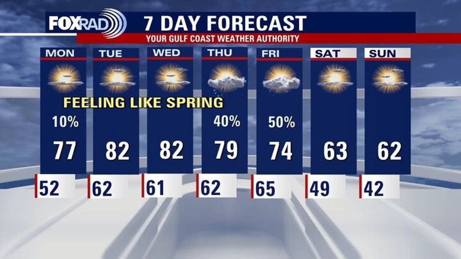 Highs move into the mid to upper 70s Monday, then climb into the low 80s by Tuesday and Wednesday, putting daily record highs in play.Â