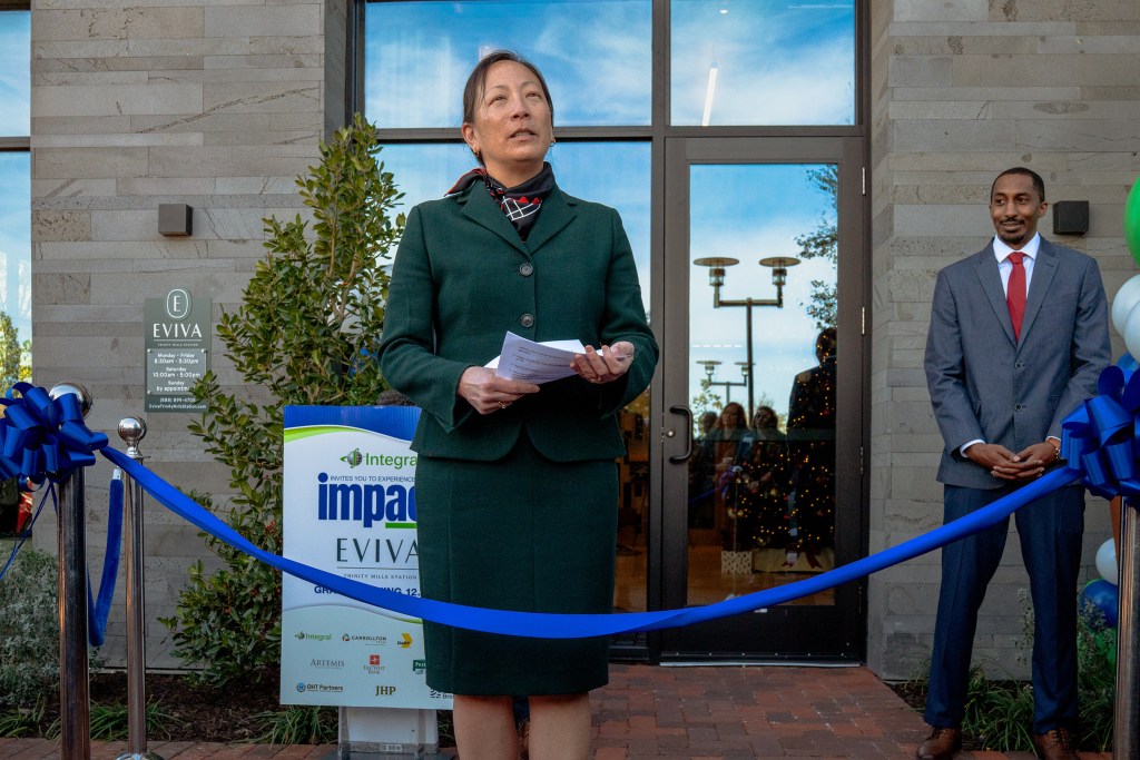 DART CEO Nadine Lee at a ribbon cutting event for Eviva, a newly developed mixed use apartment complex in Carrollton, on Nov. 10. Eviva is walking distance to the Trinity Mills Dart Station, allowing residents to access parts of the Dallas area car free. Johnathan Johnson for The Texas Tribune