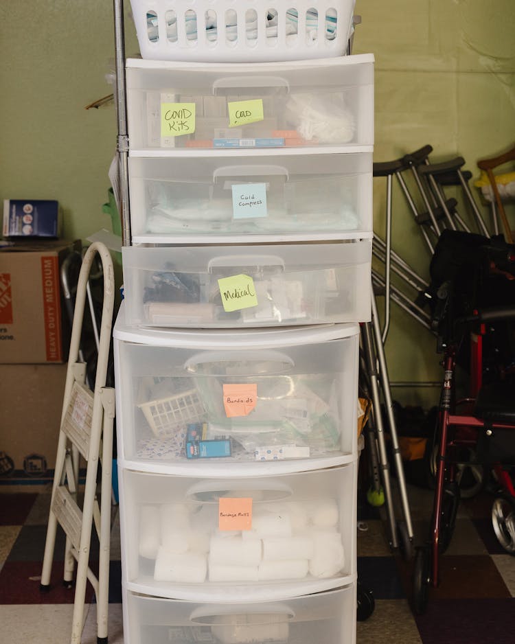 Bins full of medical supplies. Photograph by Ariana Gomez
