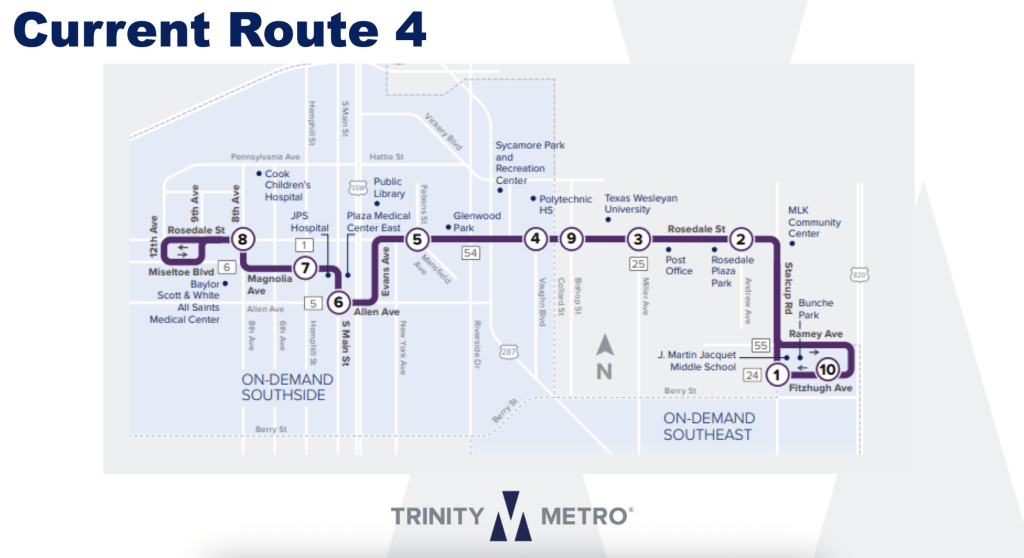 Route 4 starts in the Stop Six area near Bunche Park and Dunbar High School before it runs to East Rosedale Street past Texas Wesleyan University. The bus then goes west to Evans and Allen avenues before it cuts through the Medical District and the West Magnolia Avenue entertainment zone before heading north on 8th Avenue to West Rosedale.