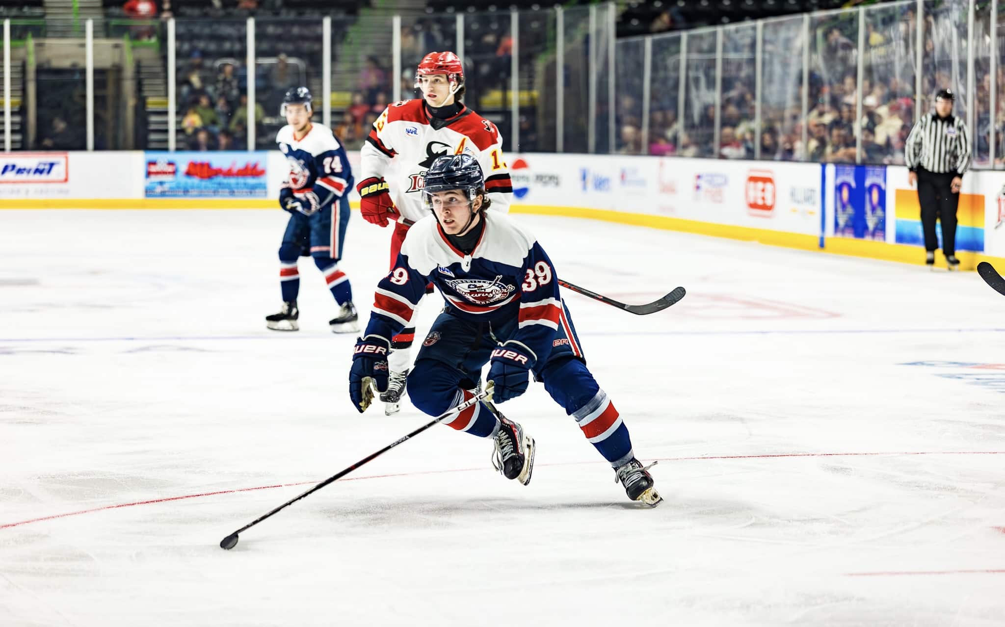 Jake Thornton of the Amarillo Wranglers skates up the ice during a game at Corpus Christi over the weekend. [Lauren Corea/ For Press Pass Sports]