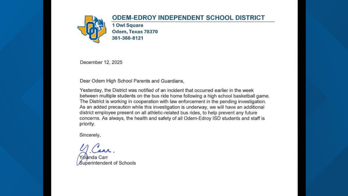 CORPUS CHRISTI, Texas — Odem-Edroy ISD has terminated one coach and placed two others on paid administrative leave following a reported sexual assault aboard a district school bus returning from a basketball game in Hebbronville, Superintendent Yolanda Carr told 3NEWS Wednesday.