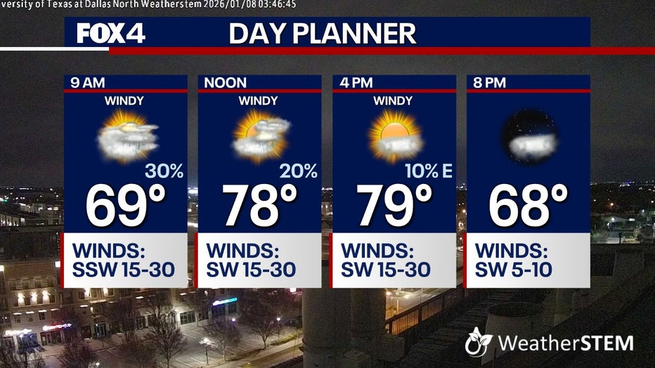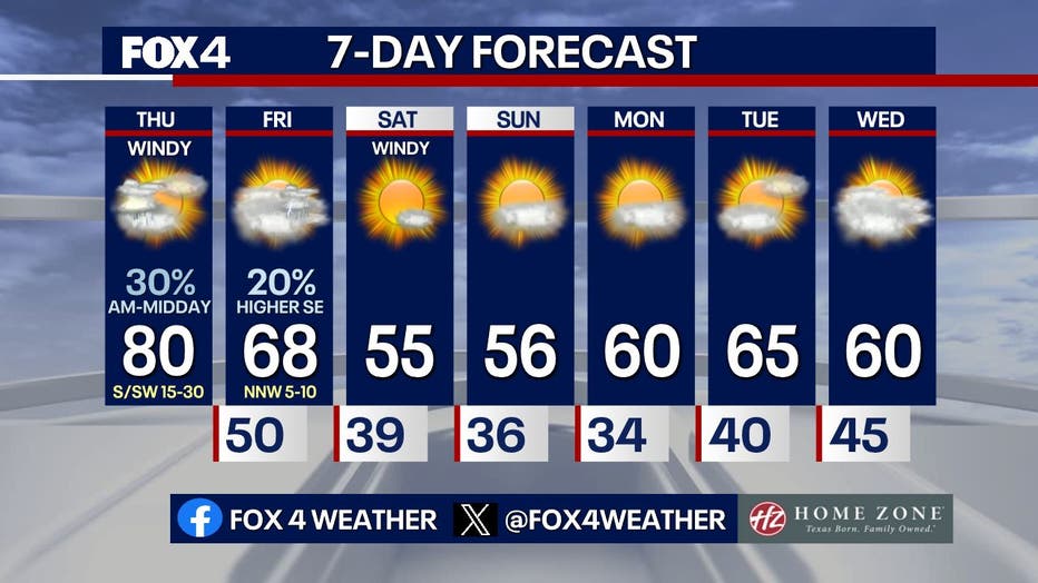 The next cold front swings through on Friday afternoon. Ahead of it, there are rain chances, especially southeast of DFW.