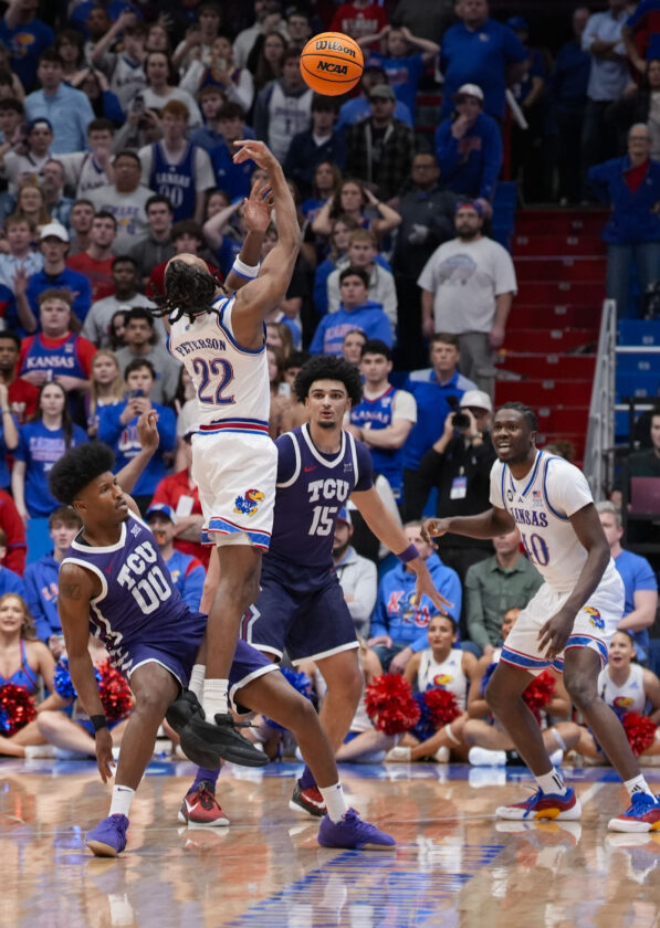 Indeed, Peterson was actually in for one more play, even though Self said he had asked to come back out after shooting the free throws. So he had subbed out for Jackson on defense. But then, in TCU guard Brock Harding’s effort to hurl the ball down the court to set up his teammates for a potential game-winning shot, he missed them altogether. That gave KU possession with 1.7 seconds to go, and another chance for Peterson to return.