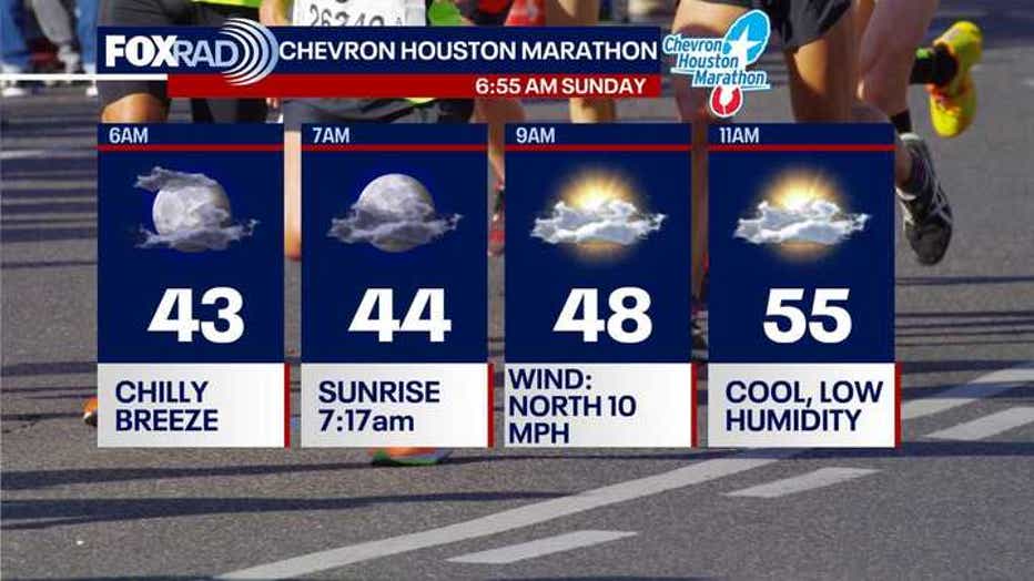 Early Sunday morning will be cold across the area, creating ideal but chilly running conditions for the Chevron Houston Marathon.Â