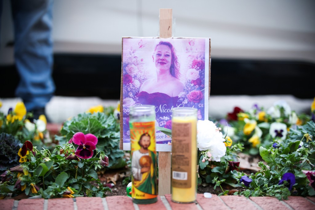 A memorial for Renee Nicole Good is displayed during the ICE out of Fort Worth protest Saturday, Jan. 10, 2026, at General Worth Square. Good was shot by a U.S. Immigration and Customs Enforcement agent in Minneapolis on Wednesday. (Christine Vo | Fort Worth Report)