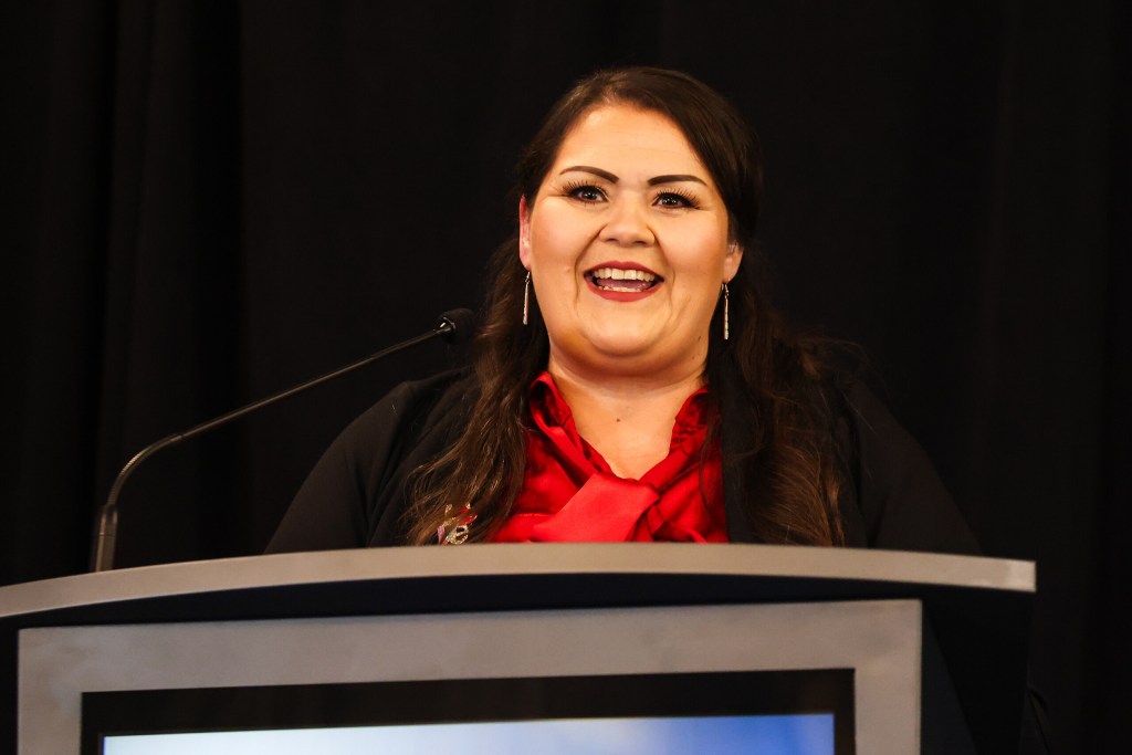 Teacher Marie Vinson holds back tears during the Chairs of Teaching Excellence event Friday, Jan. 9, 2026, in Fort Worth. As the first to graduate high school, college and soon graduate with her masters, she said literacy is more than learning how to read, but it is access to opportunity and voice. (Christine Vo | Fort Worth Report)