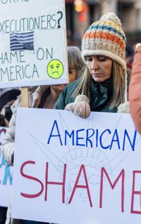 Fort Worth resident Laura Anderson, 50, looks down as she listens to speakers during a protest against U.S. Immigration and Customs Enforcement on Jan. 10 at the General Worth Square in Fort Worth. Anderson said it was her responsibility, as a person, to stand up for and protect one another.