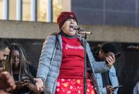 Fort Worth resident Tammy Gomez, 62, chants a poem called “Open Up Your Mouth” during a protest against U.S. Immigration and Customs Enforcement on Jan. 10 at the General Worth Square in Fort Worth. Gomez said that as a citizen, those around her who are unhappy and are not living their best lives affect her.