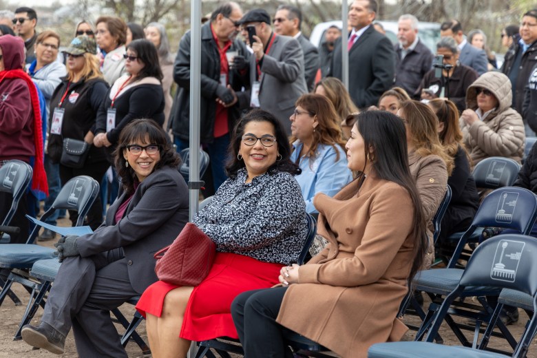 District 3 Councilmember Phyllis Viagran and former District 3 Councilmember Rebecca Viagran talk with District 5 Councilmember Teri Castillo at the groundbreaking ceremony for the new South Flores Police Substation on the South Side. Credit: Diego Medel / San Antonio Report