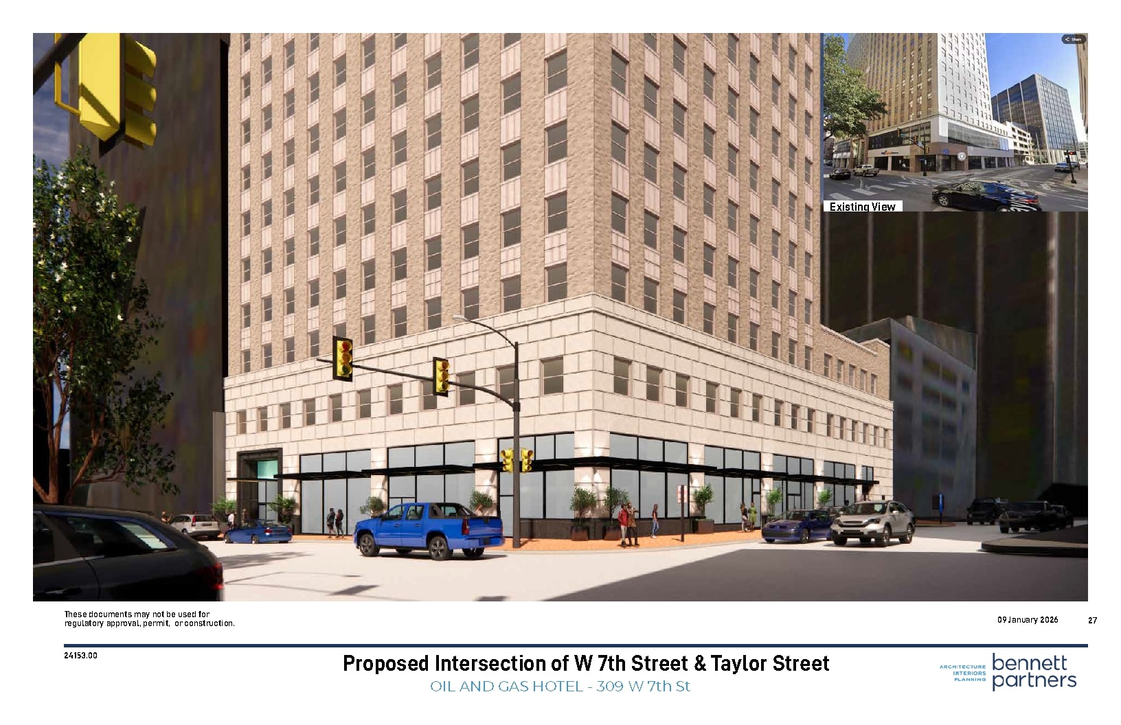 OGFW, a company based in Irving, filed plans with the city proposing renovations that would transform the former 167,000-square-foot office building at 309 W. 7th St. into a hotel on floors four through 17 with a restaurant and a bar on the roof. The lower floors would include a lobby, a spa, meeting rooms and a pool. A restaurant and bar are planned for the roof, according to the plans.