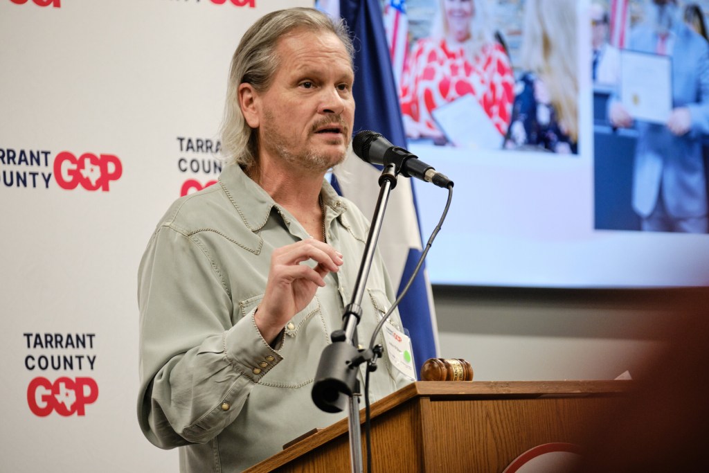 John O’Shea, a Tarrant County Republican Party precinct chair, talks to members of the party during an executive committee meeting on Jan. 8, 2026, in Fort Worth. (Drew Shaw | Fort Worth Report)