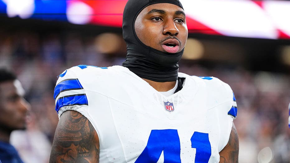 ARLINGTON, TX – NOVEMBER 23: Donovan Ezeiruaku #41 of the Dallas Cowboys looks on from the sideline during the national anthem prior to an NFL football game against the Philadelphia Eagles at AT&T Stadium on November 23, 2025 in Arlington, Te