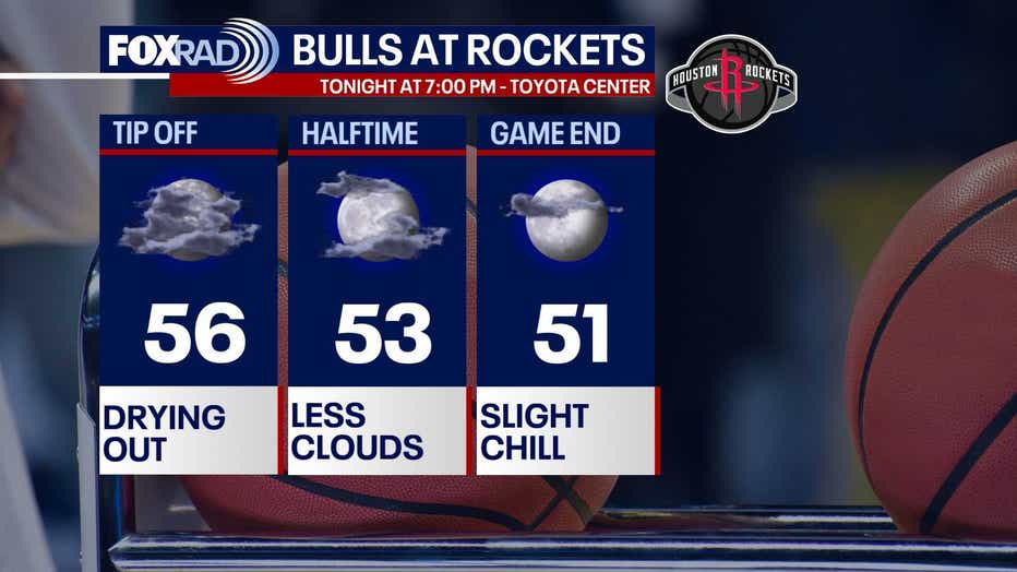 HOUSTON – Tuesday has been mostly cloudy and chilly with spotty light rain. There remains a slight chance for light rain or showers through early evening. Winds will be light, and overall this feels like typical mid-January weather rather than the unseasonable warmth seen last week. Grab a jacket if you’re heading out to cheer on the Rockets as the Bulls come to town for the 7 p.m. basketball game at The Toyota Center.