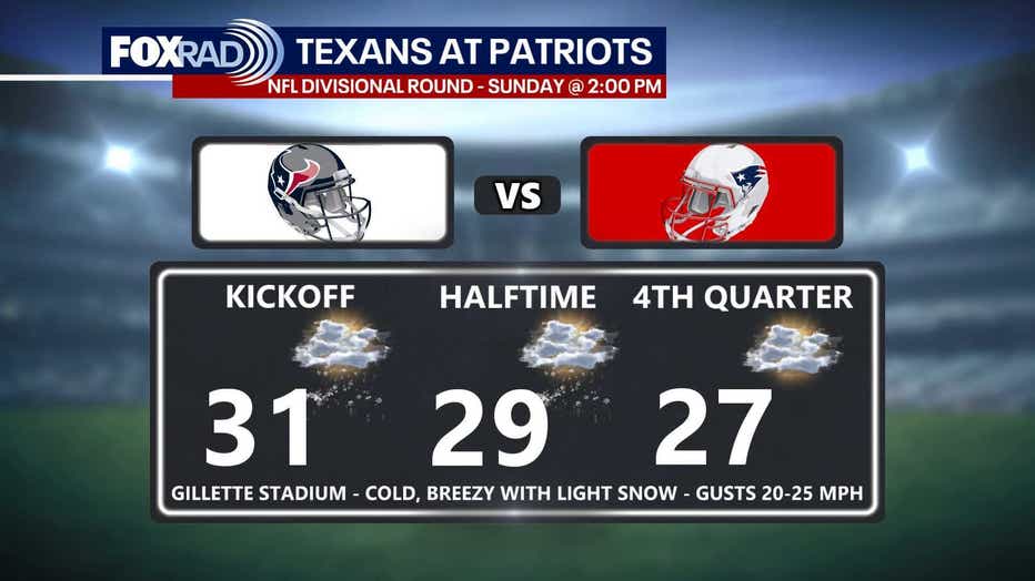 Looking ahead to Sunday’s AFC Divisional playoff game in Foxboro, the Texans will prepare for cold, windy weather at Gillette Stadium. Temperatures are expected to be in the 30s at kickoff and likely in the 20s by the 4th quarter, with swirling winds and an ugly wind chill. No major snow is currently forecast, but snow is expected in the days leading up to Sunday and some light snow is not impossible for the game.