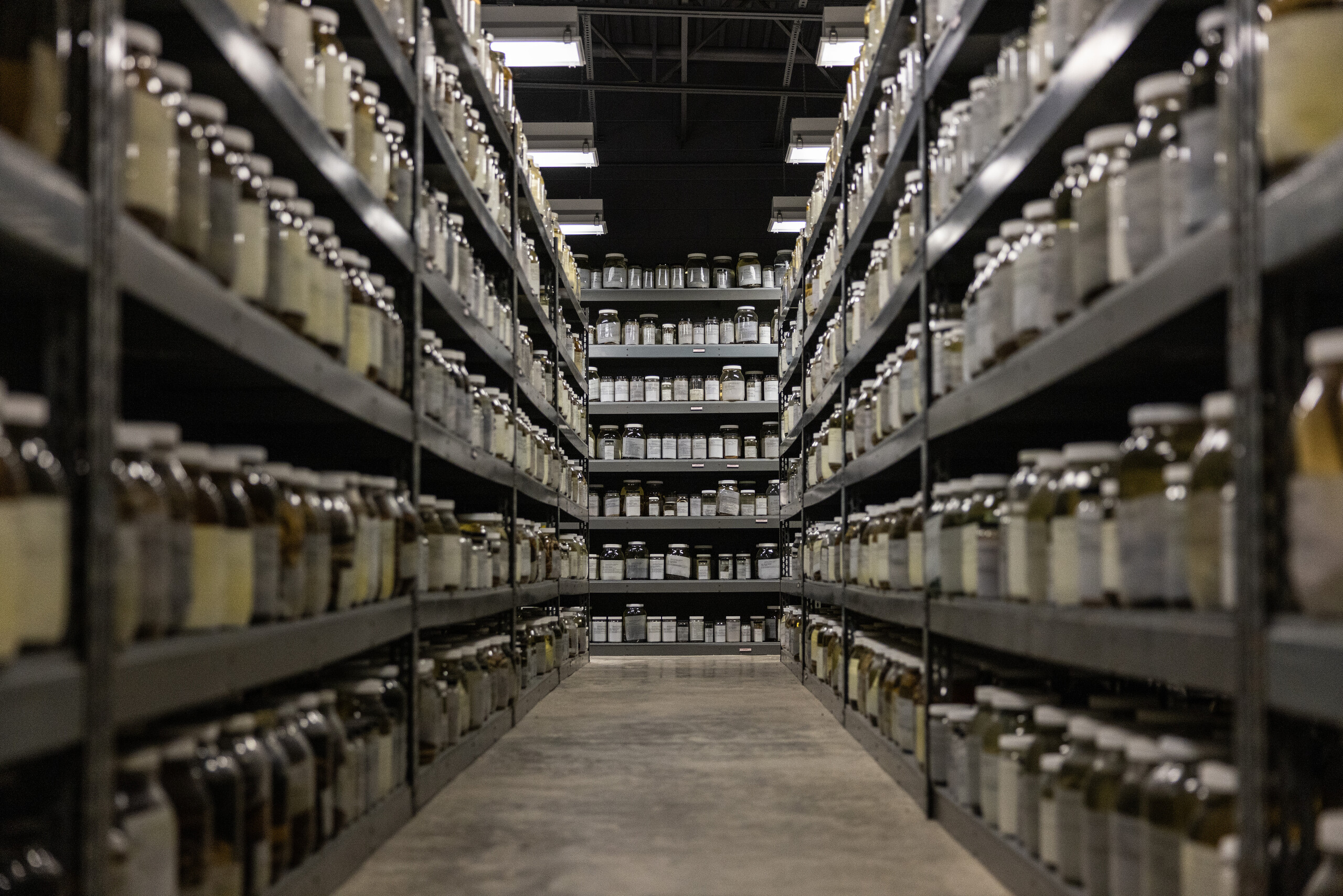 Jars of specimen line shelves of the University of Texas at Arlington Amphibian and Reptile Diversity Research Center on Jan. 7, 2026. (Maria Crane | Fort Worth Report/CatchLight Local/Report for America)