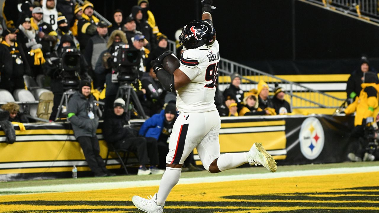 Houston Texans defensive tackle Sheldon Rankins runs to the end zone for a touchdown after recovering a fumble during the second half of an NFL wild-card playoff football game against the Pittsburgh Steelers, Monday, Jan. 12, 2026, in Pittsburgh. (AP Photo/Justin Berl)