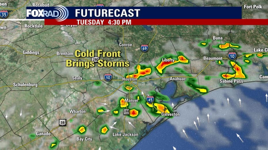 Tuesday ramps up with a cold front fueling a decent chance for afternoon scattered thunderstorms, especially south of Houston. Rain will most likely hold off until after 1 p.m., so prepare for the chance for rain after school Tuesday.