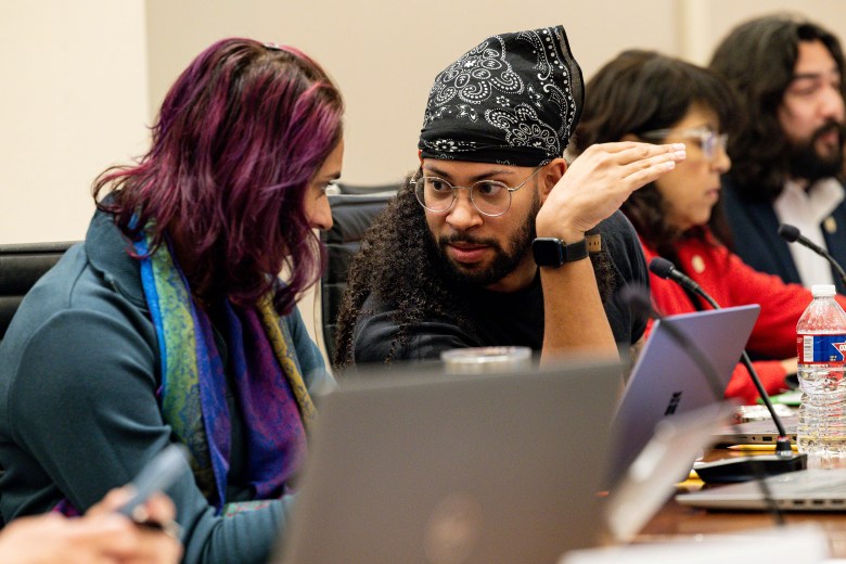 Councilman Jalen McKee-Rodriguez (D2) chats with Councilwoman Sukh Kaur (D1) at City Hall on Wednesday. Credit: Amber Esparza / San Antonio Report